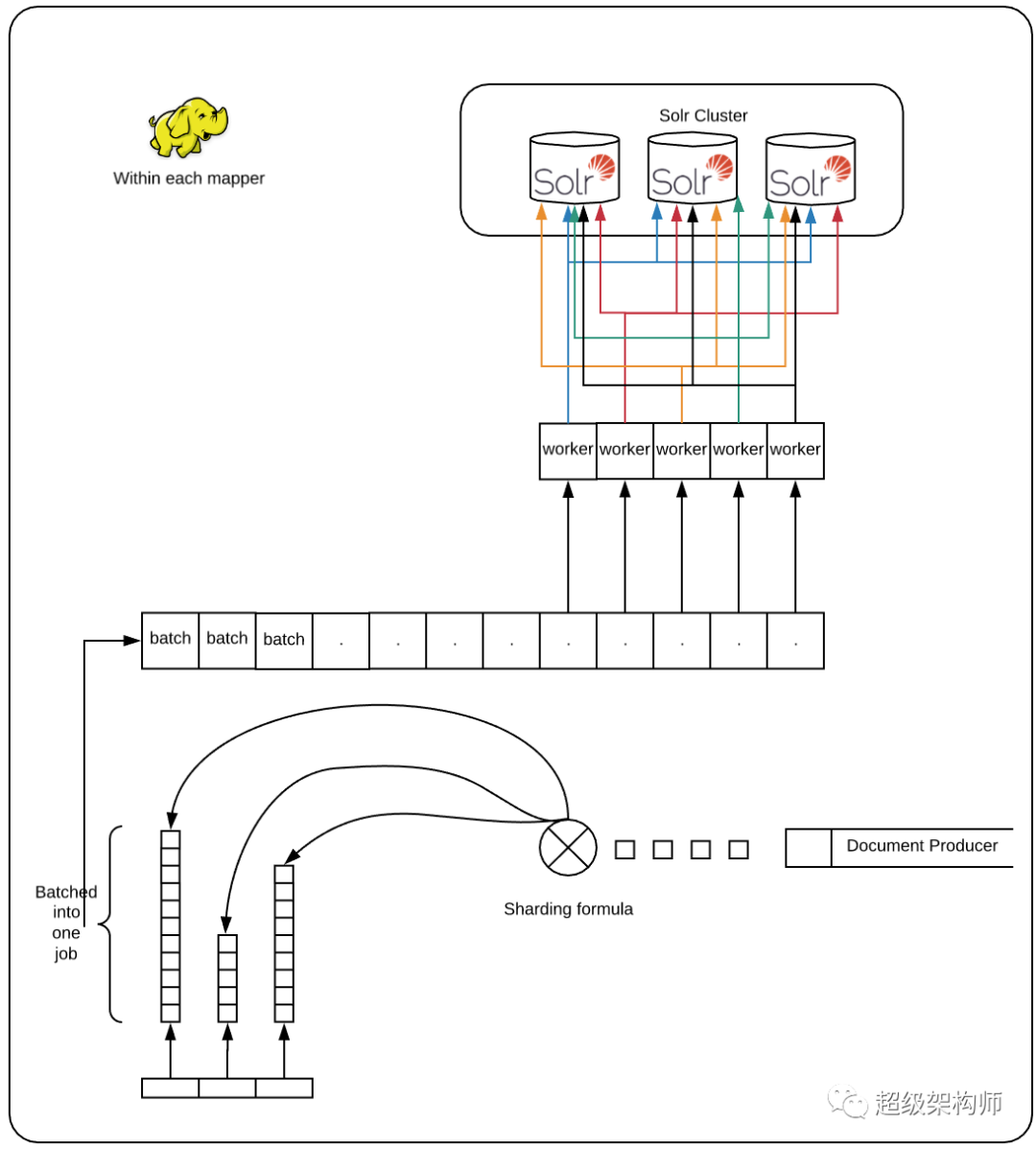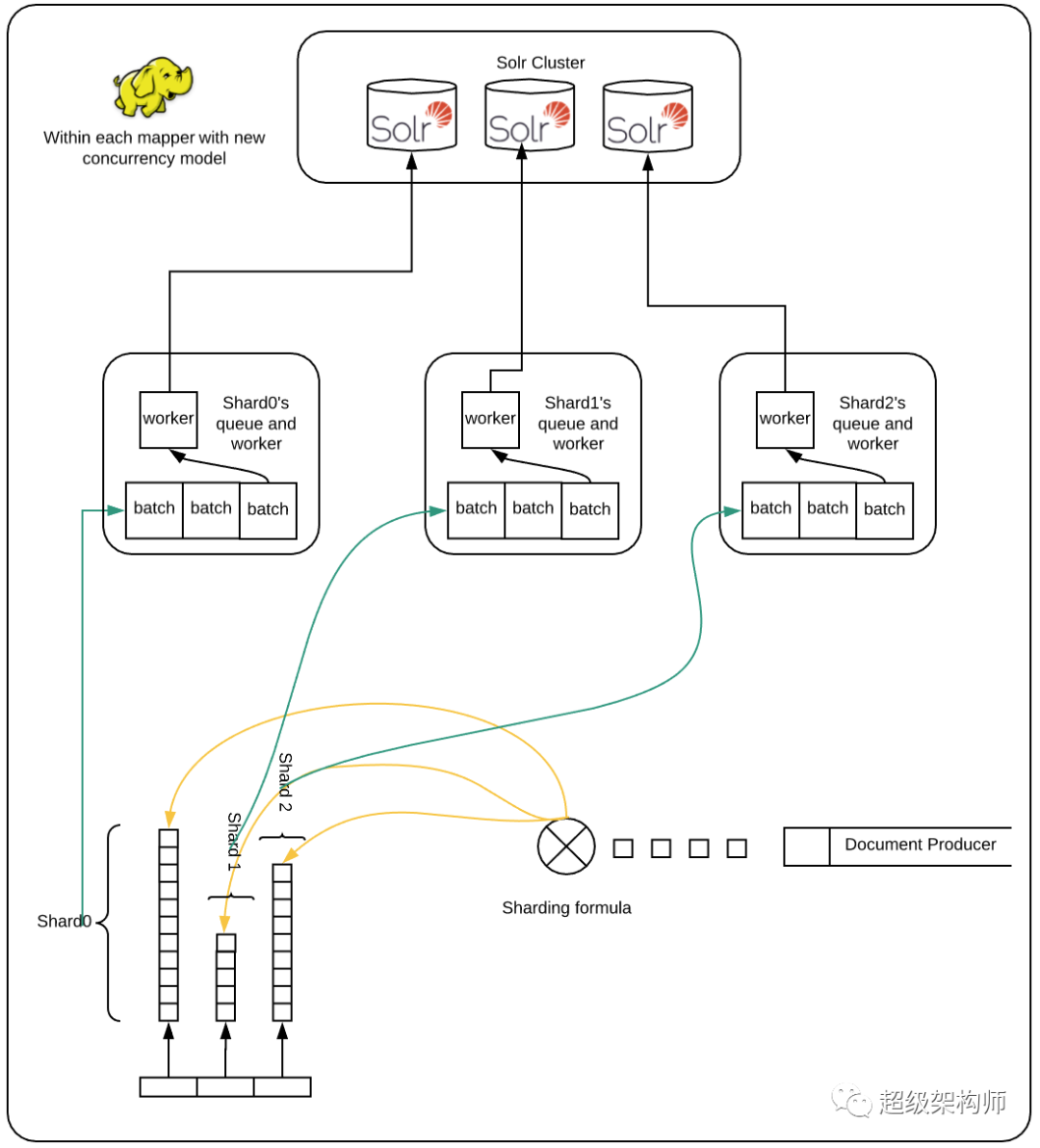 更具可扩展性的模型将涉及映射器和 Solr 分片之间的队列。并且应该有特定于分片的客户端,它们可能运行在分片的主机上,它将从队列中读取分片的文档并发送到 Solr 进行索引(通过 REST API 或 SolrJ)。