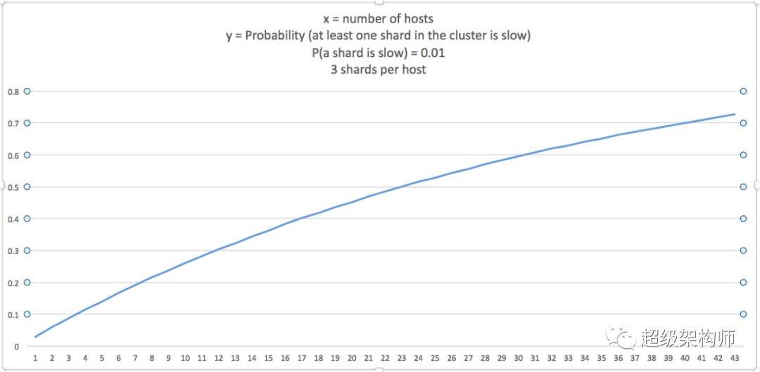 如果我们假设对于给定的时间间隔 p = 0.01,这是 P 的图表(集群中至少有一个分片很慢):
