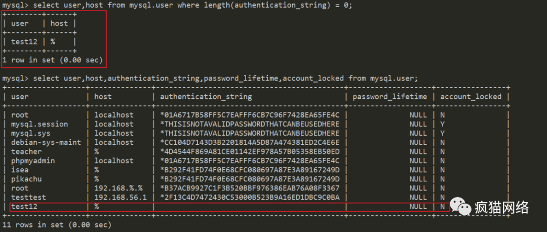 select user,host,authentication_string,password_lifetime,account_locked from mysql.user;