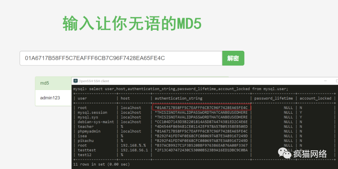 有些人为了方便,可能会把数据库用户的密码设置为弱口令,现在的数据库会以mysql5加密算法加密口令,可以去MD5解密的平台输入密文,看能否得出明文。