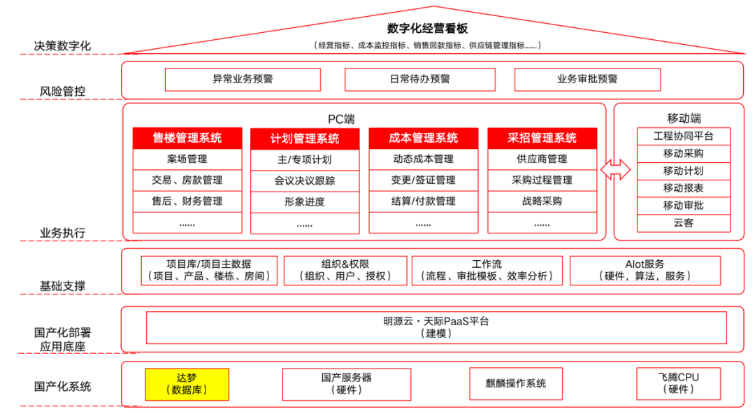 达梦数据与明源云共同打造的、基于国产化体系的不动产ERP系统解决方案,开创了不动产领域ERP业务系统自主创新的先河。该方案以国产数据库(达梦)+明源天际PaaS平台+国产服务器+国产操作系统(麒麟)+国产CPU硬件(飞腾)为底座,在企业营销、成本、招采和计划运营领域实现全业务数字化管理,能够极大提升企业的运营管理效率和科技自主水平。