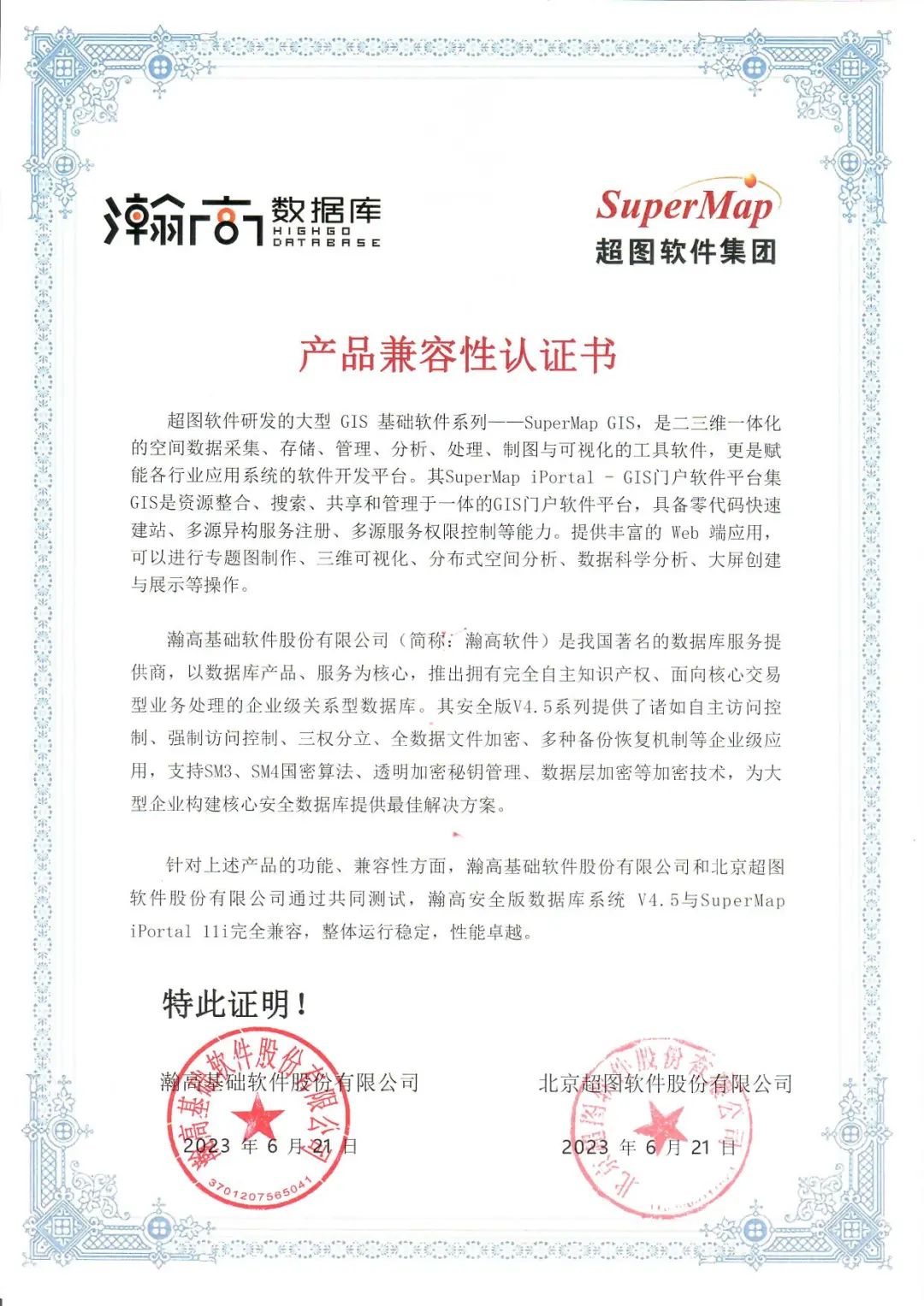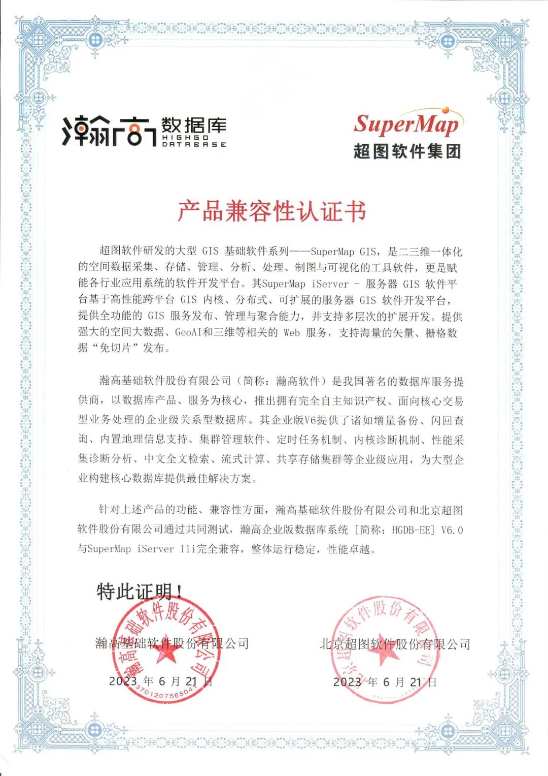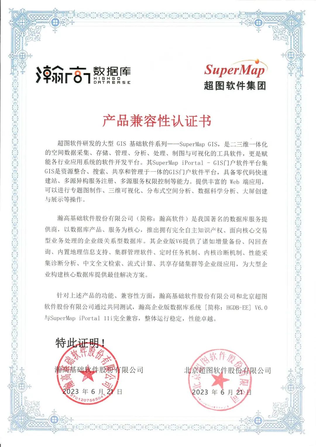 经测试,瀚高HighGo DB的系列产品与超图SuperMap GIS 11i的系列产品顺利适配,其功能、性能和兼容性等各方面表现良好,运行稳定、安全,性能卓越,可以满足用户的需求,为企业级应用提供良好支持。此次双方产品的相互认证,进一步强化了瀚高与超图合作的广度和深度,充分发挥各自优势,更好地为自然资源,水利,交通,智慧城市等行业提供全方面的技术支撑,共同推进信息技术应用创新产业的生态繁荣。