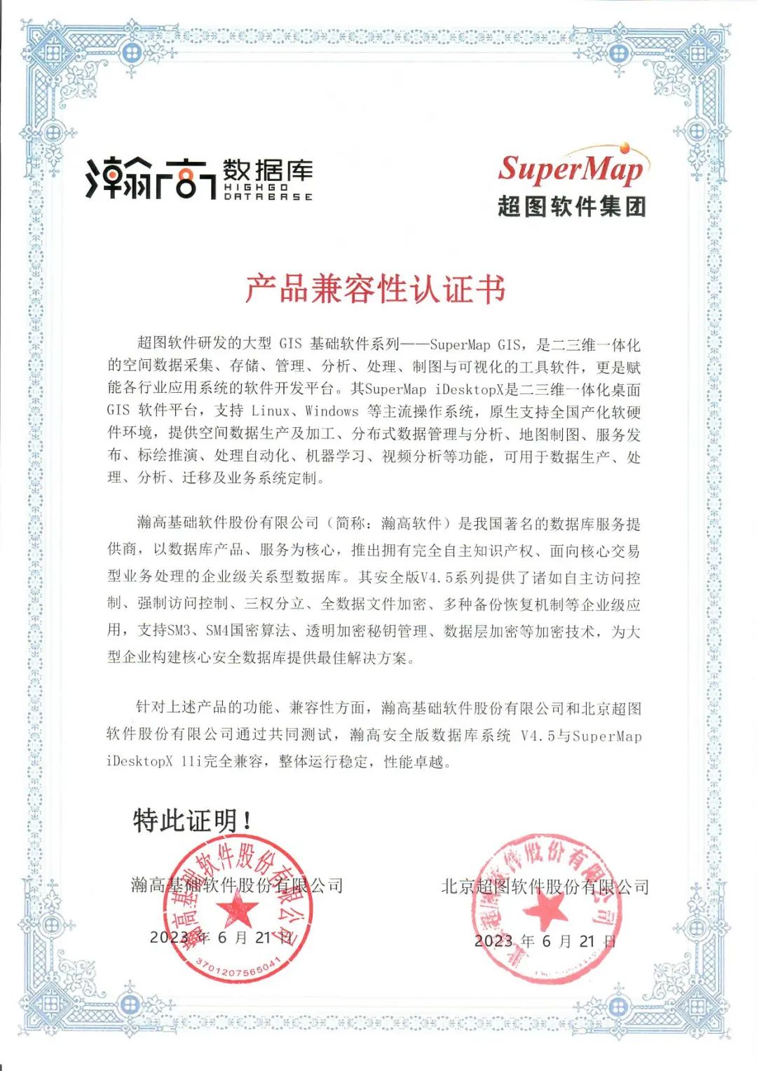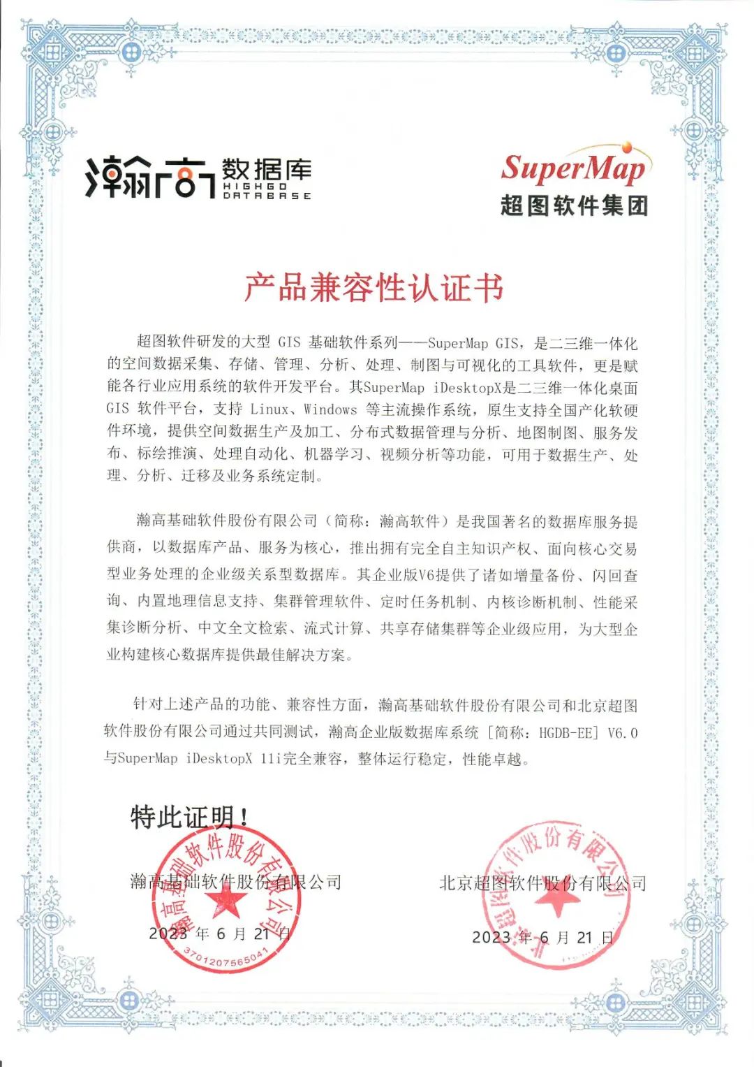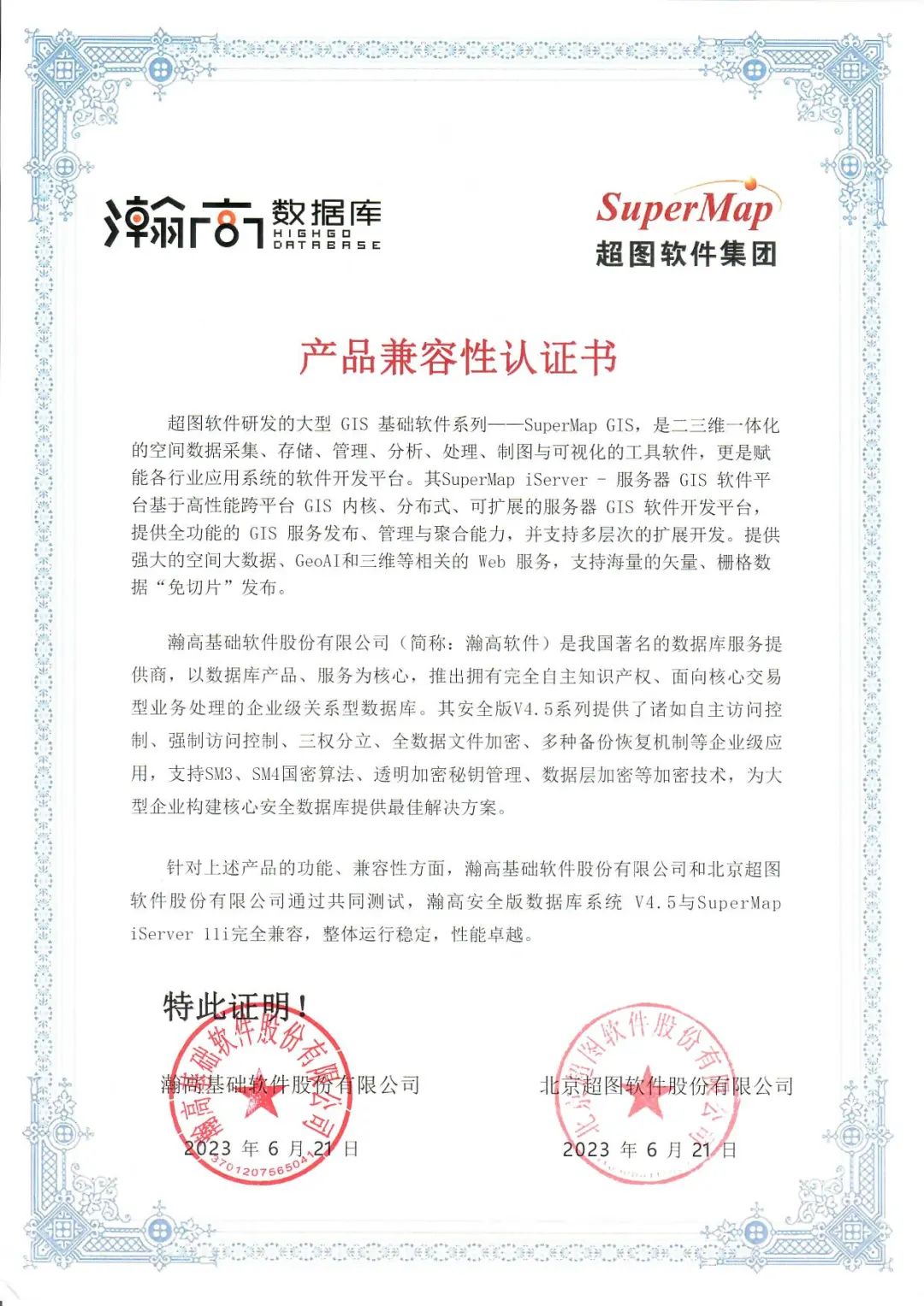 经测试,瀚高HighGo DB的系列产品与超图SuperMap GIS 11i的系列产品顺利适配,其功能、性能和兼容性等各方面表现良好,运行稳定、安全,性能卓越,可以满足用户的需求,为企业级应用提供良好支持。此次双方产品的相互认证,进一步强化了瀚高与超图合作的广度和深度,充分发挥各自优势,更好地为自然资源,水利,交通,智慧城市等行业提供全方面的技术支撑,共同推进信息技术应用创新产业的生态繁荣。