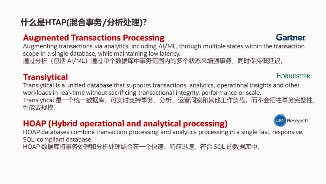 之后,HTAP又出现了许多其他的提法,例如在最近的报告中,Gartner 开始将 HTAP 称为“增强交易”。另一家分析公司 Forrester Research 将同一概念称为“Translytical”,而 451 Group 则将其称为“混合操作和分析处理”或 HOAP。