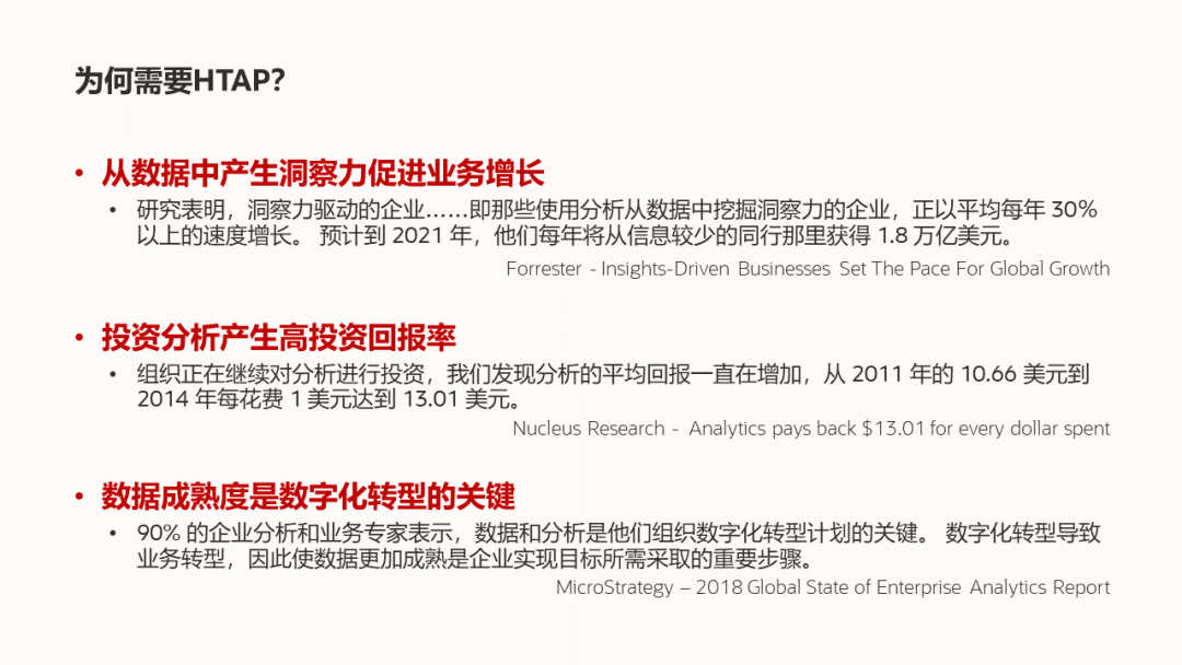 从多版本一致性,分区,压缩,Exadata,到Database In-Memory,具有40多年积累的Oracle数据库的HTAP能力是多维度,全方位的。这也使得Oracle超越了简单数据库的定义,成为用户数智化转型的坚实数据底座和数据平台。