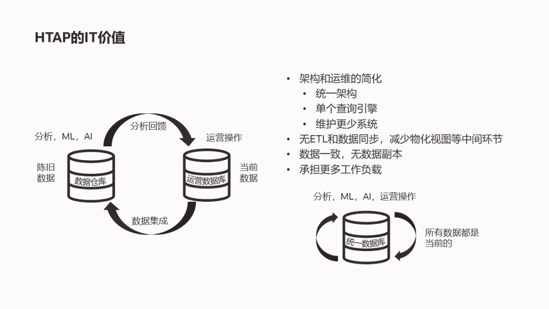 HTAP也能带来IT架构的改进,在传统的分析系统中,OLTP和OLAP系统是分离的。为了保证数据分析的实时性,还必须增加GoldenGate或类似的CDC组件。这无形中增加了配置和维护的工作量,同时数据存在两份,一致性的问题也必须考虑。而在HTAP系统中,只需要维护一套系统,数据就地分析,应用无需改变,完全符合“简单即美”(Simplicity is beauty)的原则。