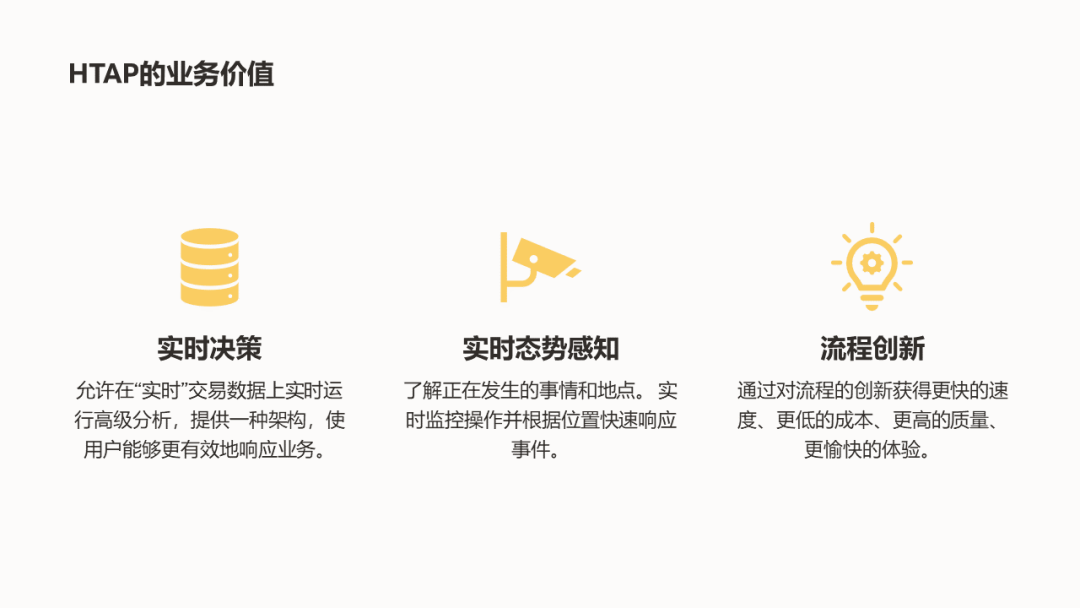 HTAP的业务价值主要体现在3方面,即实时决策,实时态势感知和流程创新。