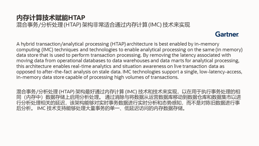 在Gartner最初的定义中,提到了内存计算技术。确实,随着数据量的不断增大,加速分析的一个有效手段就是内存计算技术。2014年,Oracle推出了全新的数据库组件:Database In-Memory,从而解决了用户必须在交易系统和分析系统中做出选择的两难困境,Database In-Memory使得Oracle数据库实时分析能力大幅增强,用户可以在同一个数据库中实现事务处理和实时分析,正如Gartner定义所说:“打破了事务处理和分析之间的界限”。