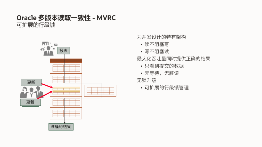 第一个HTAP能力就是Oracle数据库的多版本读取一致性(Multi-Version Read Consistency),这种读写互不阻塞的能力使得OLTP和OLAP可以良好共存,从而提升系统的吞吐量。MVRC是Oracle数据库一项非常基础的能力,而Oracle数据库的美也正是体现在这些基础能力之上。