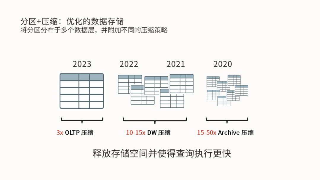 您可能没有想到,Oracle压缩也是Oracle数据库的一项HTAP能力。由于可以缓存更多的数据,Oracle压缩可以提高OLTP查询的性能。对于OLAP系统,压缩可以大幅节省数据存储空间。压缩和分区结合,可以实现优化的数据存储。