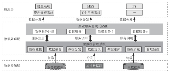 此架构包含数据资源层、数据处理层以及应用层。数据资源层存储了整个企业的数据资源, 其中业务数据库与主数据数据库是存放企业数据资源的主要载体, 同时企业的数据资源也可能来源于其他数据源的分发, 数据资源层是企业的基础, 企业内所有业务开展以及日常工作的运转均依赖于数据资源层的稳定运行;数据处理层是主数据管理平台形成的数据总线, 该平台应包含数据建模、数据整合、数据分发、数据维护以及数据质量管理等核心功能, 在企业信息化中发挥核心作用, 主数据管理平台通过将不同数据资源进行集成, 为上层应用系统提供运行支撑;最上一层的应用层为企业各个应用系统, 负责企业的日常业务处理。
