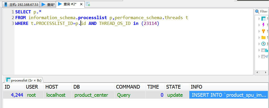 select p.* from information_schema.processlist p,performance_schema.threads t where t.PROCESSLIST_ID=p.id and THREAD_OS_ID in (23114)