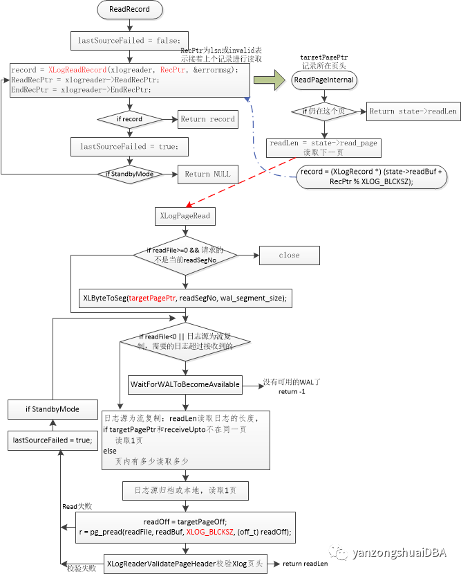 3、ReadRecord调用函数XLogReadRecord读取下一个WAL记录,若请求的记录不在当前页中,则需要读取一页到内存。如果读取的record为NULL,且是备机则切换日志源,从下一个日志源读取WAL