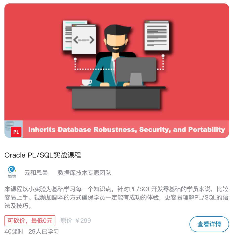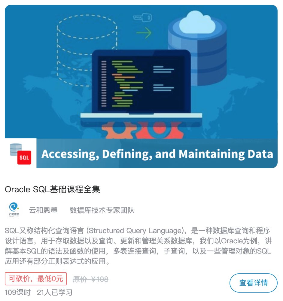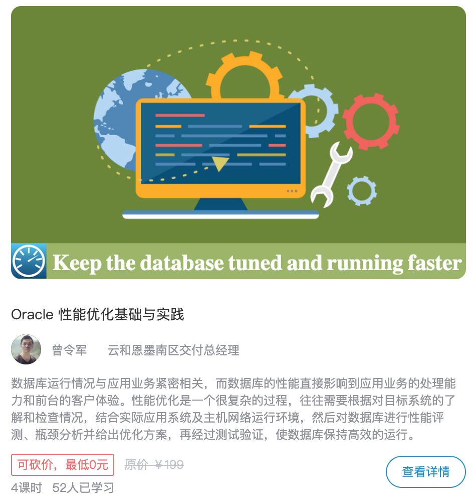 恩墨课程内测阶段共有630人参与我们的限时优惠活动,目前活动仍在继续,1元即可获得每周更新的《2019云和恩墨大讲堂》,以及《Oracle 12C 高手之路》课程,欢迎大家下载PPT及课件在线观看视频学习,已适配手机。 为感谢大家的支持,现更新三个Oracle系列课程,共153课时,支持砍价,最低0元获取(扫描文末二维码或者阅读原文发起砍价)。假期开始了,也许那些比你优秀的人已经开始了旅行,趁现在赶紧给自己充电吧。