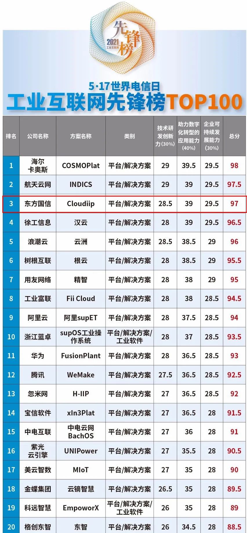 2021年5月17日是第53个世界电信和信息社会日,今年世界电信日主题为“在充满挑战的时代加速数字化转型”。值此之际,“工业互联网世界”评审组在《通信产业报》与工业互联网世界新媒体平台发布了工业互联网先锋榜TOP100,东方国信凭借技术优势与丰富的产品解决方案获评第三,领跑工业互联网。