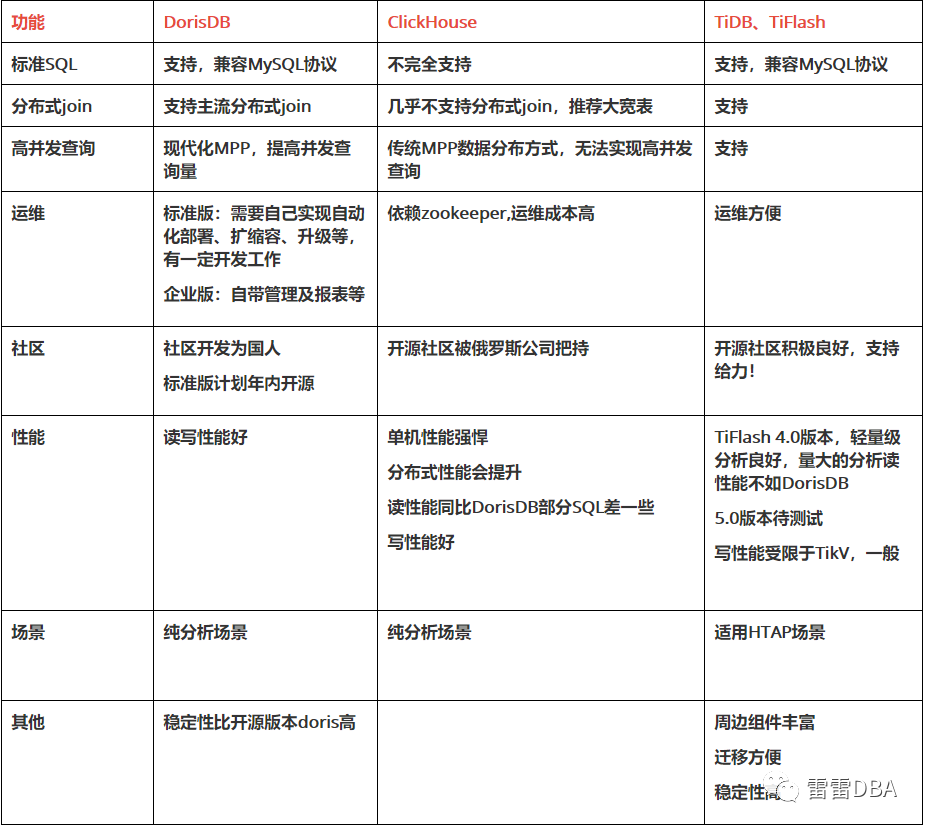 为了满足这些分析型业务的需求,DBA团队从2021年初就开始调研各类分析型数据库,其中包括DorisDB、TiFlash、ClickHouse等,评测他们的性能及功能。