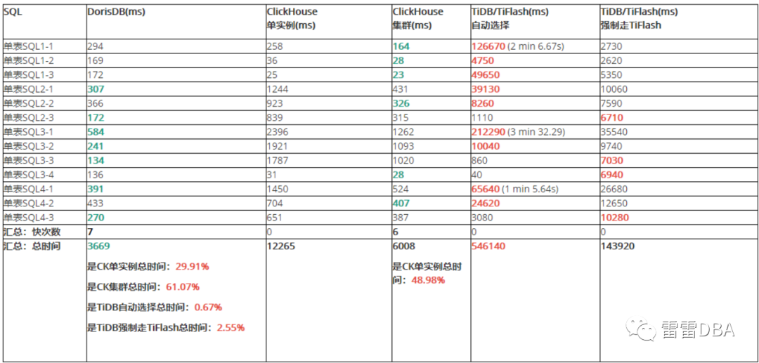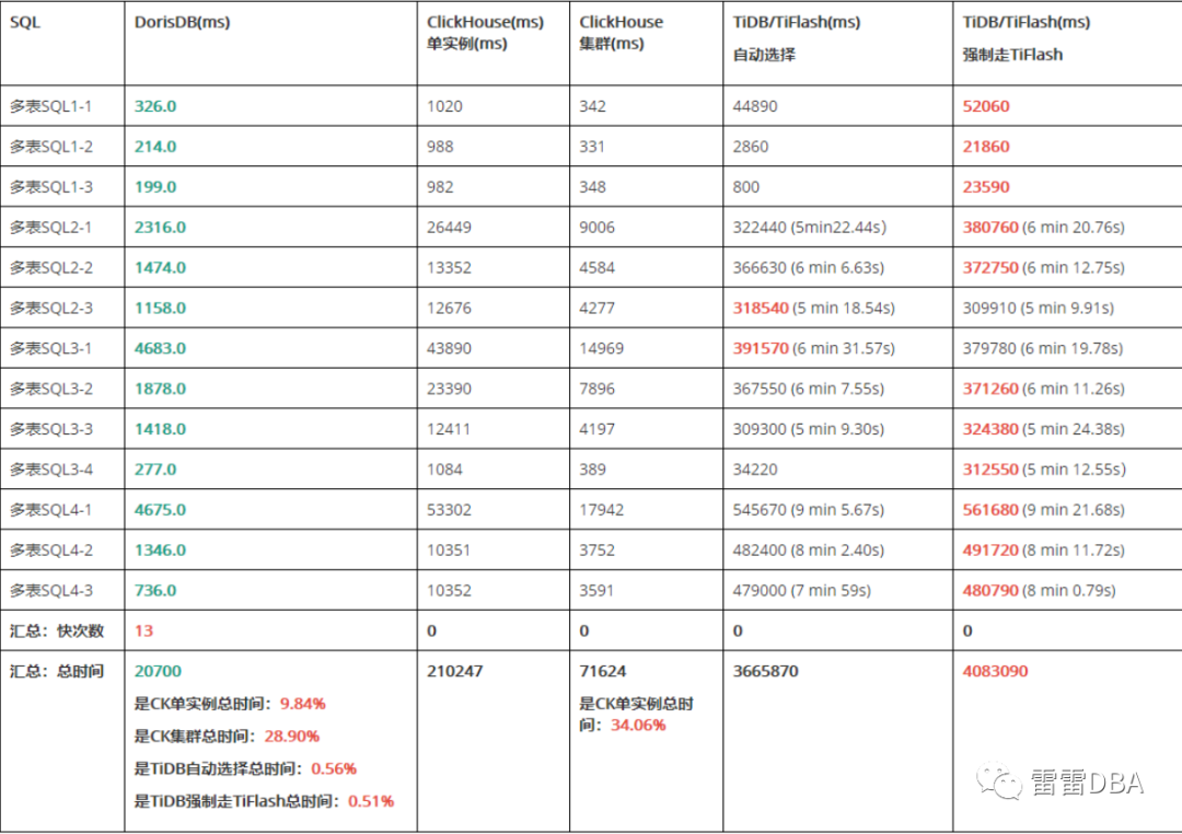 TiDB/TiFlash总体时间单表/多表查询均最长