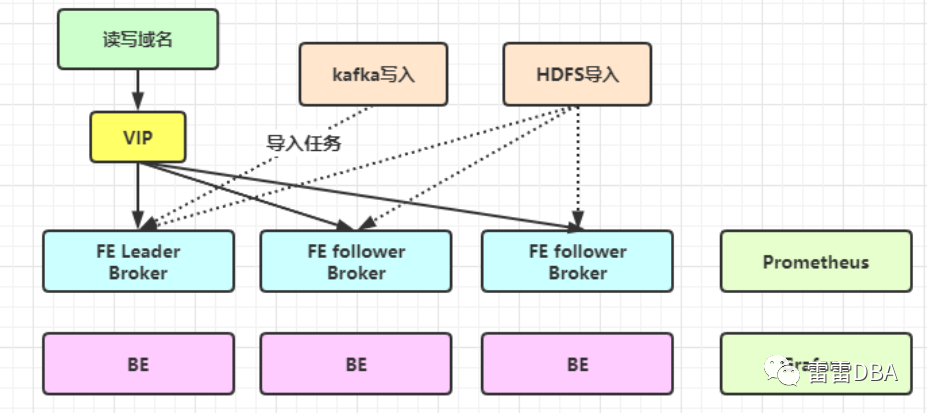目前为单套集群,3个FE,3个BE ,Broker按需建立,搭建1套监控(Prometheus+Grafana),推荐使用kafka来接入数据。