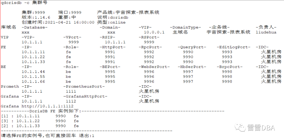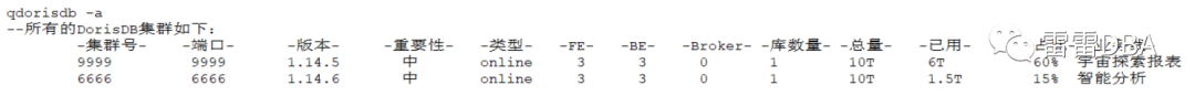 目前我们自己已经实现了部分运维规范的制定,例如集群端口、目录、拓扑架构等,并开发了拓扑工具:qdorisdb,可以查看所有集群、指定集群、登录、展示监控节点信息等。