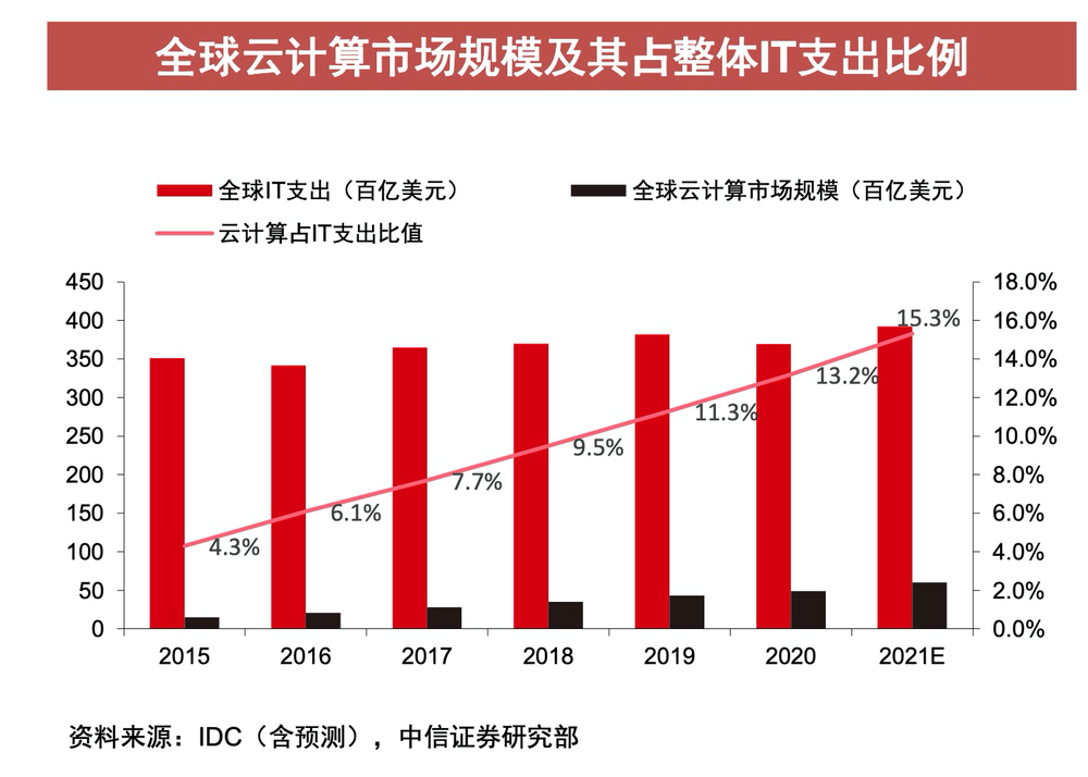 但上云只是阶段性过程,终极目标,是将新能力扩展至整个企业IT市场,达成数字化转型。2020年,全球云计算市场占整体IT支出规模为13.2%,是5年前的3倍。