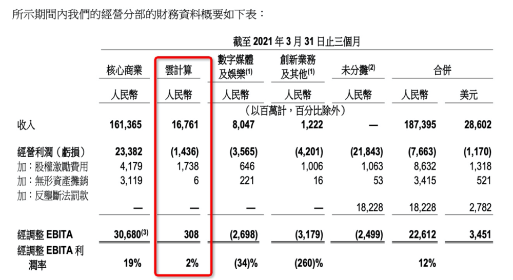阿里巴巴财报中关于云计算业绩的,一共三组数据:营收、利润、增速。