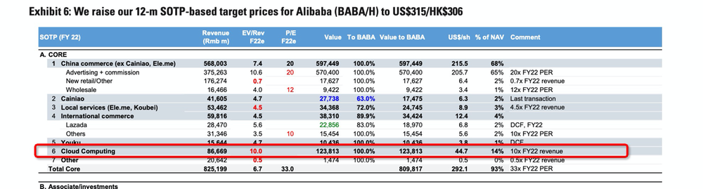 去年,高盛曾对阿里集团进行估值,其中涉及阿里云的部分,给出1238亿美元。这个数字是基于10倍的PS值和对未来两年的业绩预期计算得出,在当时的计算报告中,高盛预估阿里云在2021财年增速为48%。以阿里财报看,阿里云50%的增速是超过预期的。