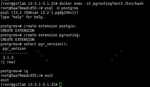 docker run -itd --name pgroutingTest3 \-v /docker/pgroutingTest3/data:/var/lib/postgresql/data \-e POSTGRES_PASSWORD=root -p 5432:5432 \pgrouting/pgrouting:13-3.1-3.1.3