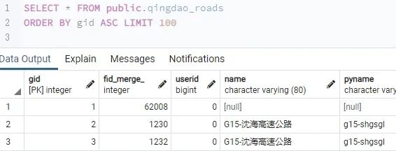 创建表的名称默认是与导入的shp文件数据的文件名是一样的,如qingdao_roads。默认路段的几何信息是存放在geom字段。