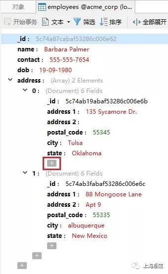 ⦁ 在 Navicat 编辑器中以“树视图”打开她的信息。展开第一个地址文档,然后点击地址字段下方的加号(+)以插入上面的三个 DBRef 字段: