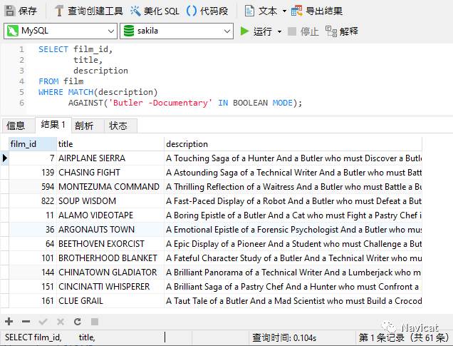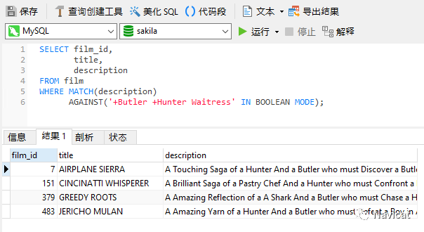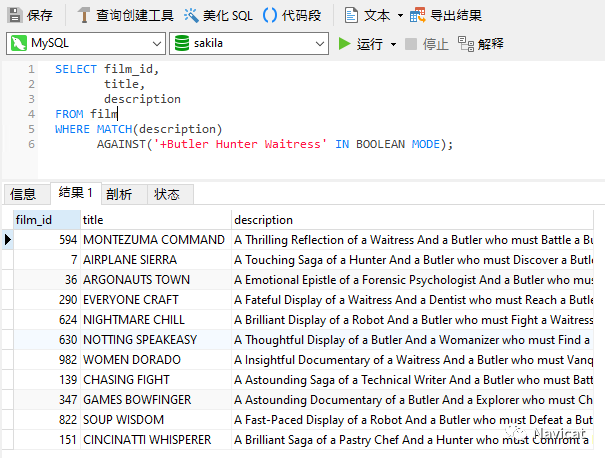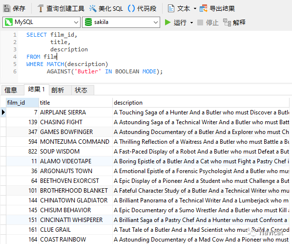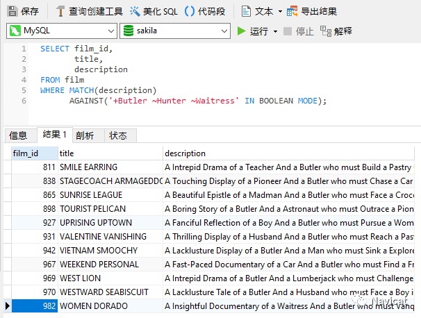 要在Boolean模式下执行全文搜索,请在AGAINST表达式中包含IN BOOLEAN MODE修饰符。回想一下,在上一期文章中,我们向Sakila示例数据库的电影表中添加了全文索引,以便可以在description字段中执行全文搜索。这是一个示例,该示例返回所有描述中包含“Butler”一词的电影: