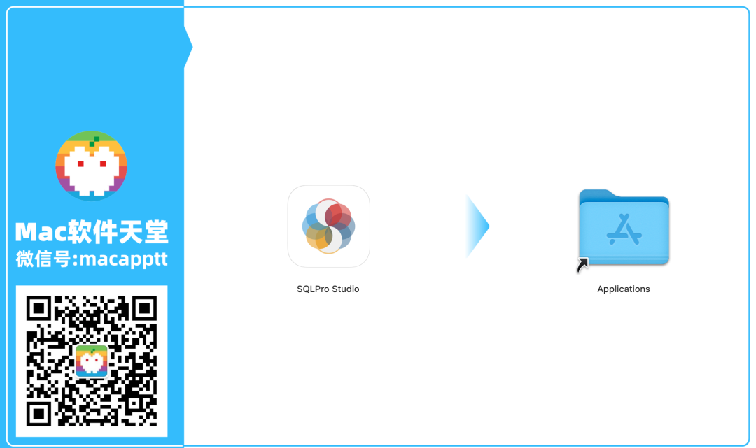 关注「Mac软件天堂」回复文末处的关键词即可获取软件的下载链接,将SQLPro Studio软件包下载完成后,可以看到其中有两个文件(夹),按照其中的提示将“SQLPro Studio”软件拖拽至“应用程序”文件夹即可成功安装。
