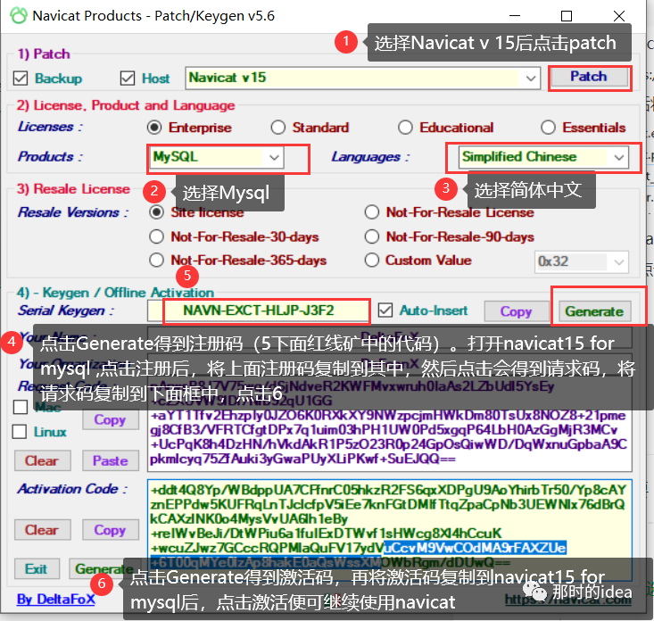 上面的截图是我激活完成后的截图,需要在navicat和Navicat_Keygen_Patch中来回操作,关键步骤是将红5框中的内容复制粘贴到navicat15 for mysql中得到请求码,再将请求码复制到Navicat_Keygen_Patch的Request Code中后点击Generate得到激活码,再将激活码复制到navicat15 for mysql中即可。
