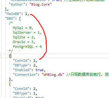 "DBS": [/*MySql = 0,SqlServer = 1,Sqlite = 2,Oracle = 3,PostgreSQL = 4*/{"ConnId": 1,// 连接id,可以配置到数据库"DBType": 2,// db类型,枚举,具体的看上边"Enabled": true,// 是否开启当前数据库db"Connection": "WMBlog.db" // 连接字符串},{"ConnId": 2,"DBType": 1,"Enabled": true,"Connection": "Server=.;Database=WMBlogDB;User ID=sa;Password=123;","ProviderName": "System.Data.SqlClient"},{"ConnId": 3,"DBType": 0,"Enabled": false,"Connection": "Server=localhost; Port=3306;Stmt=; Database=wmblogdb; Uid=root; Pwd=456;"},{"ConnId": 4,"DBType": 3,"Enabled": false,"Connection": "Provider=OraOLEDB.Oracle; Data Source=WMBlogDB; User Id=sss; Password=789;","OracleConnection_other1": "User ID=sss;Password=789;Data Source=(DESCRIPTION=(ADDRESS_LIST=(ADDRESS=(PROTOCOL=TCP)(HOST=192.168.8.65)(PORT=1521)))(CONNECT_DATA=(SERVICE_NAME = orcl)))"}],