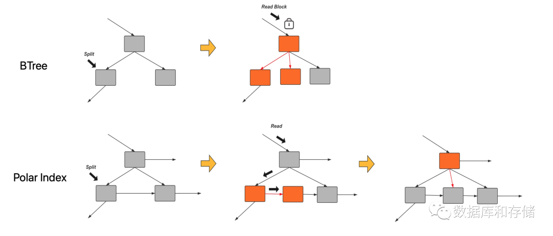 阶段1: 将一个page 进行split 操作, 然后建立一个link 连接在两个page 之间. 下图Polar Index 就是这样的状态