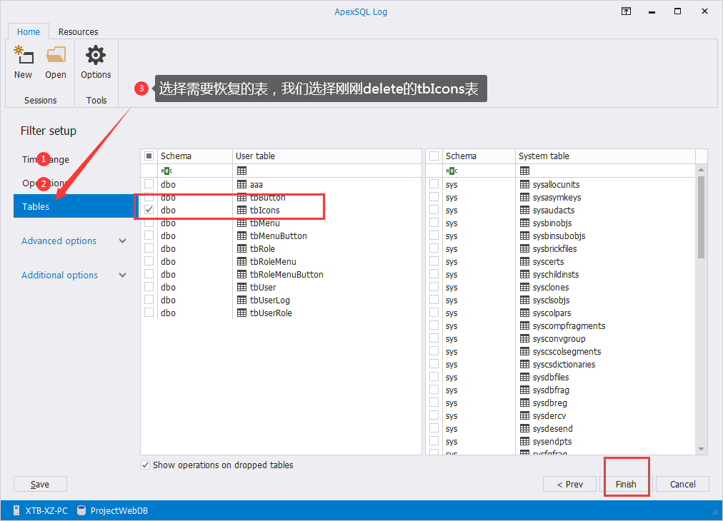 4、选择需要恢复的时间、恢复的数据类型、恢复的数据表,然后点击Finish
