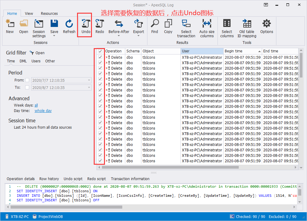 使用ApexSql Log 2018工具恢复刚刚删除的数据