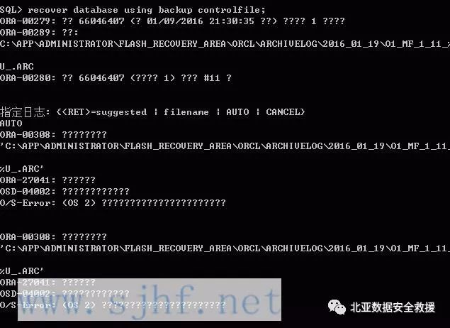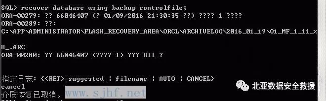 恢复数据库需要2016_01_19的11号归档日志。由于归档日志丢失,使用cancel参数进行不完全恢复。