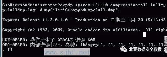 expdp 导出数据库报错,和上面查询报同样的错误。sysaux01.dbf文件损坏导致expdp工具不可用,导出数据库失败。尝试使用exp导出数据库