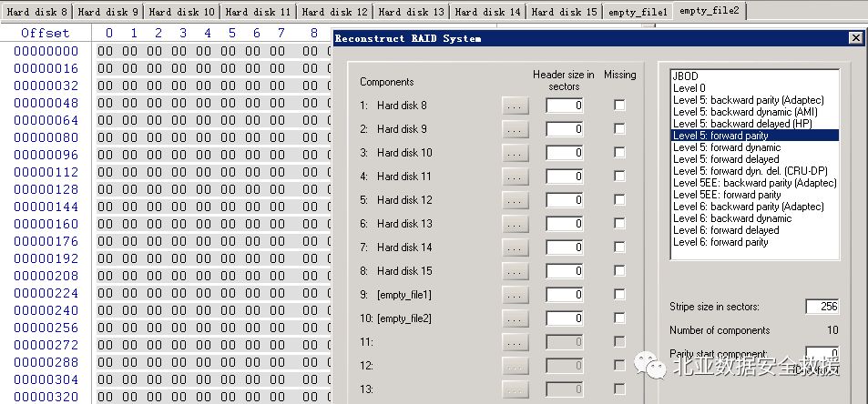 重组过程中发现本raid5缺失2块盘(第一掉线盘掉线后热备盘顶替,之后又掉线一块盘使得RAID5处于降级状态。最后在掉线第三块盘时盘片划伤RAID崩溃),无法通过校验直接获取丢失盘的数据,所以只能使用磁盘同等大小的全0镜像进行重组(此方法只可用于紧急情况,因为依赖空镜像组成的raid文件系统结构会被严重破坏,相当于每个条带都会缺失两个块的数据)。