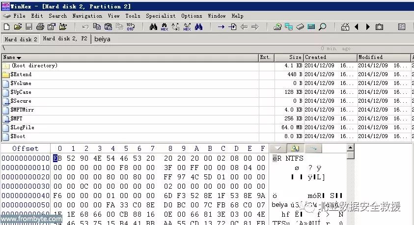 3、 分析丢失数据硬盘的文件系统:打开正常,不符合病毒破坏的表现特征,同时经杀毒软件检测无病毒。再仔细分析硬盘的文件系统,发现此文件系统的元文件创建时间为11月28日,表明文件系统的创建时间为11月28日,与数据丢失的时间相吻合。通常这种故障表明:文件系统被人为重写了,即分区被格式化了。