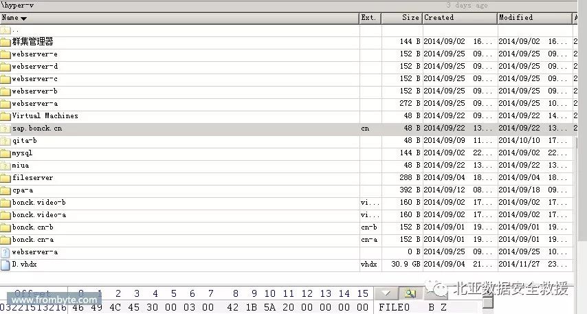 对扫描到的所有文件索引项做详细的分析,发现其索引项都是不连续的,并且大多都是以16K或8K对齐的。正常情况下的文件索引项是连续的,大小为固定的1K,每个文件索引项对应一个文件或目录。而扫描出来的这些不连续,并且不完整的文件索引项是无法正常索引到文件的内容。因此需要对扫描出来的文件索引项做加工处理。在扫描出来的文件索引项中搜索” .VHD”,能找到一个” .VHD”的文件记录。然后将这个片连续的文件索引项提取出来。接着再查看这段提取出来的文件索引项中是否有指向下一段文件索引项的记录或者是H20属性。如果有则根据文件索引项中的特征去匹配下一段文件索引项,如果没有则跳过这段文件索引项。根据以上方法基本能查到大多数的文件索引项片段。而缺失的文件索引项片段有可能被破坏了,但是可以从数据备份盘中去查找缺失的文件索引项片段,因此基本可以搜索到大部分的文件索引项。