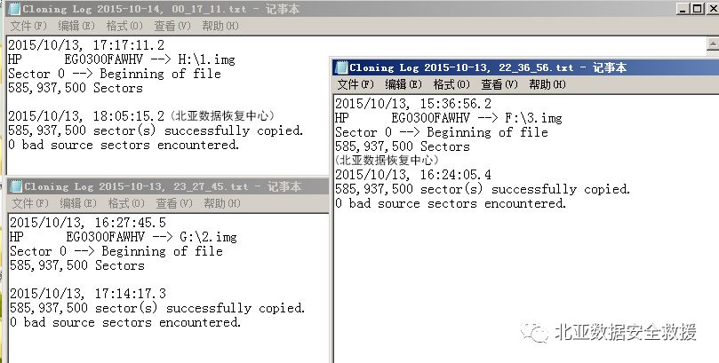 1、 为了确保现存磁盘中数据的安全,先对磁盘做只读镜像备份,三块硬盘可以正常读取,没有发现坏道,只读镜像备份日志。