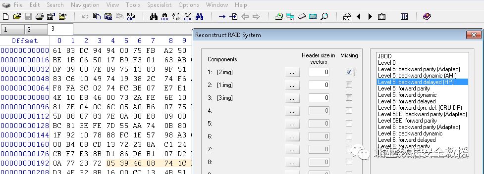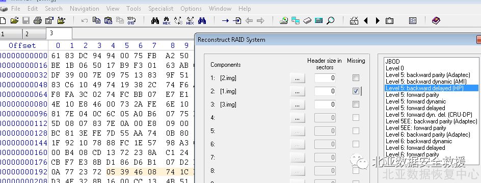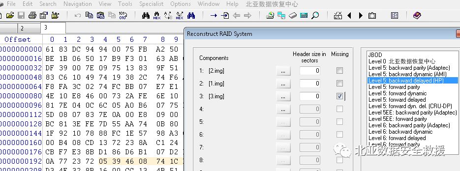 3、 RAID分析过程,尝试多种硬盘离线状态下提取数据,每块盘离线所提取的数据都是一样的,具体情况如下图所示: