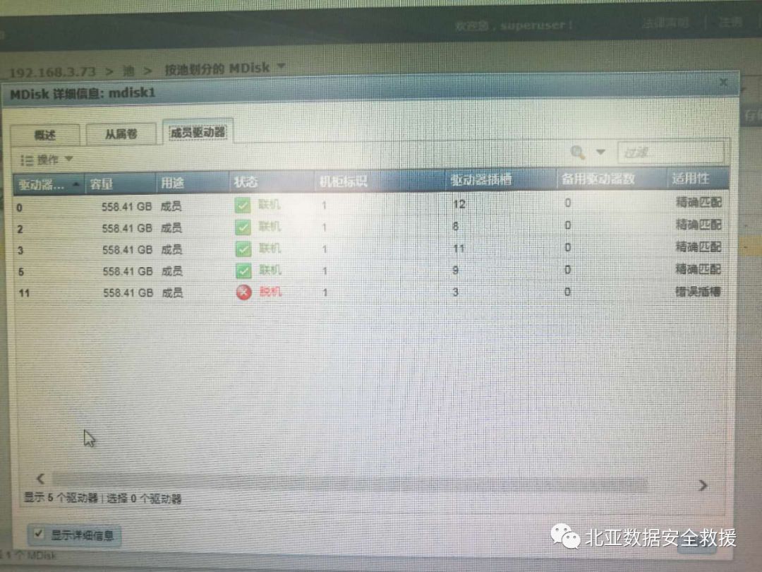 根据raid5的特性得知,其最大允许一块成员盘离线,即在有一块成员盘故障的情况下还可以正常使用。客户存储设备已经失效,各组Mdisk中只有一块硬盘离线。