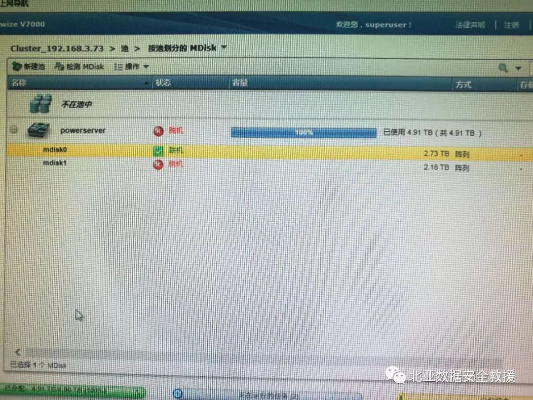 客户的阵列柜中共创建了2组Mdisk,加到一个pool中,现客户主要数据pool无法加载,其中共三个通用卷均无法挂载,具体情况如下图所示: