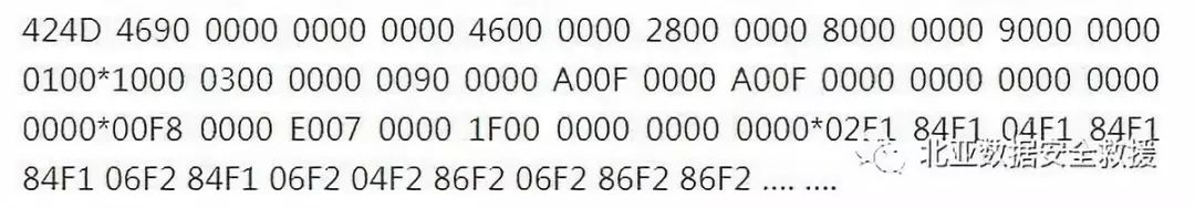 11)18-19:用字节数表示的位图数据的大小,该数必须是4的倍数,数值上等于位图宽度×位图高度×每个像素位数。0090 0000为00009000h=80×90×2h=36864。