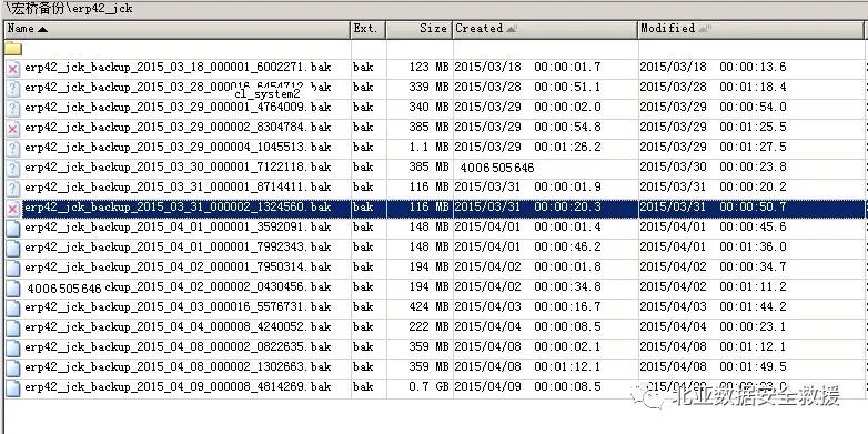 由于上述两个方向实施完后,并没有将所有的数据库文件全部恢复出来,还有cl_system3.dbf和erp42_jck.dbf这里个文件因缺失部分页导致其无法正常使用。因此需要采用备份来恢复这两个数据库文件,但是在检查完这两个文件的备份后发现cl_system3.dbf的3月30号全部备份因备份机制故障导致没有备份出来,而erp42_jck.dbf的3月份备份全部没有,只有4月份的全部增量备份