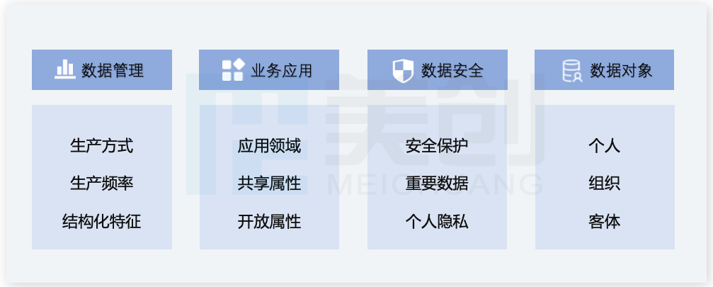 按照科学性、规范性、实用性和拓展性四大原则,根据数据的来源、用途、内容、业务以及管理对数据进行归类,公共数据分类维度主要有以下四类:数据管理、业务应用、数据安全和数据对象。