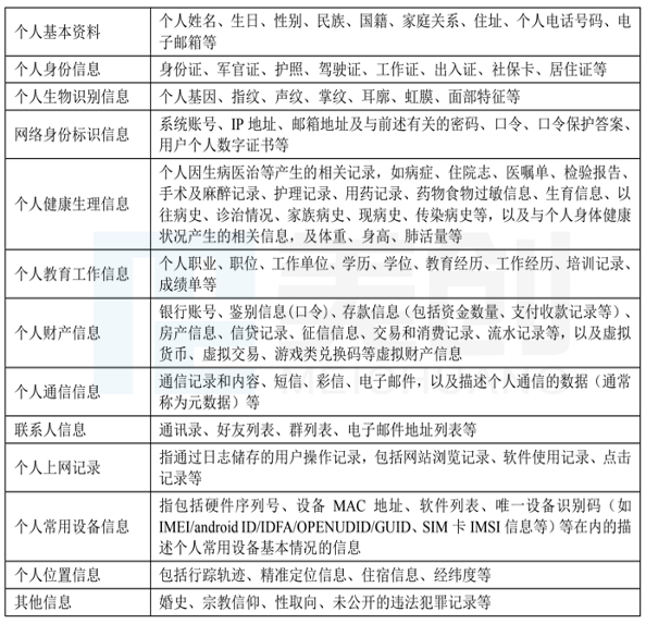再根据《信息安全技术 个人信息安全规范》中对个人信息的定义,将个人信息分类为: