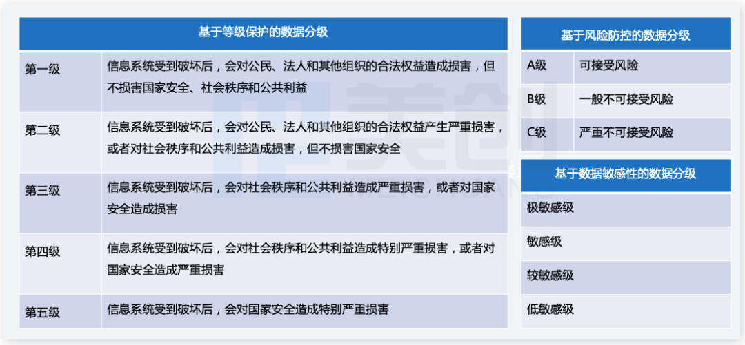 实践过程中,根据实际情况在每个类别可对数据进行分级,并根据各级的安全管控需求,梳理安全控制点,提出分级分类的安全管控规则,常见的分级原则有以下三种:基于等级保护的数据分级、基于风险防控的数据分级、基于数据敏感性的数据分级。